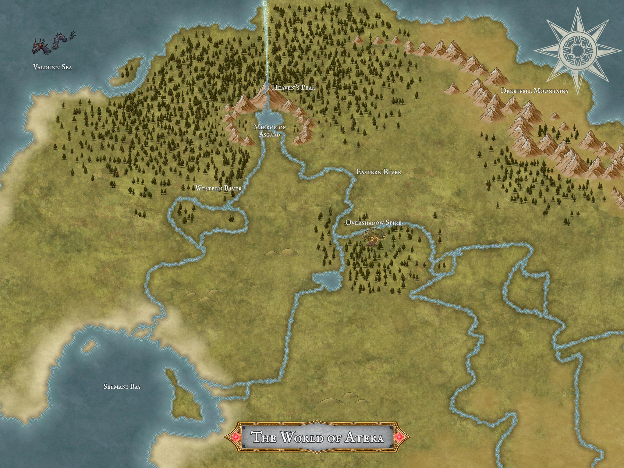 Atera, casually known as Hringr or The Circle, is a minor realm that sits just below Asgard on Yggdrasil. This realm is a very biodiverse world filled with a variety of Biomes, including forests, meadows, mountain ranges, oceans and more. Extreme differences such as arctic or desert conditions are minimal, but present in a few zones. But what stands out the most is what gives the realm it's namesake - a ring of small mountains surrounding a clearing. The central ring of Atera is a large clearing at the base of a mountain called Heaven's Peak. This is considered a safe location to the flora and fauna that live in Hringr, and it is the birthplace of Móðir. All waywicks, as well as a variety of other species, have access to Atera.Heaven's Peak is named such because of a waterfall starting at the peak of the mountain. The pool at the top of the mountain is fed directly from Aether and it is believed to be a gift from Asgard. Because of this, that top pool is considered a sacred place. The Sacred Pool waterfalls into a larger lake at the base of the mountain, called The Mirror of Asgard which feeds two rivers flowing throughout the realm. These rivers provide sustenance for both the plant and animal life within the area.