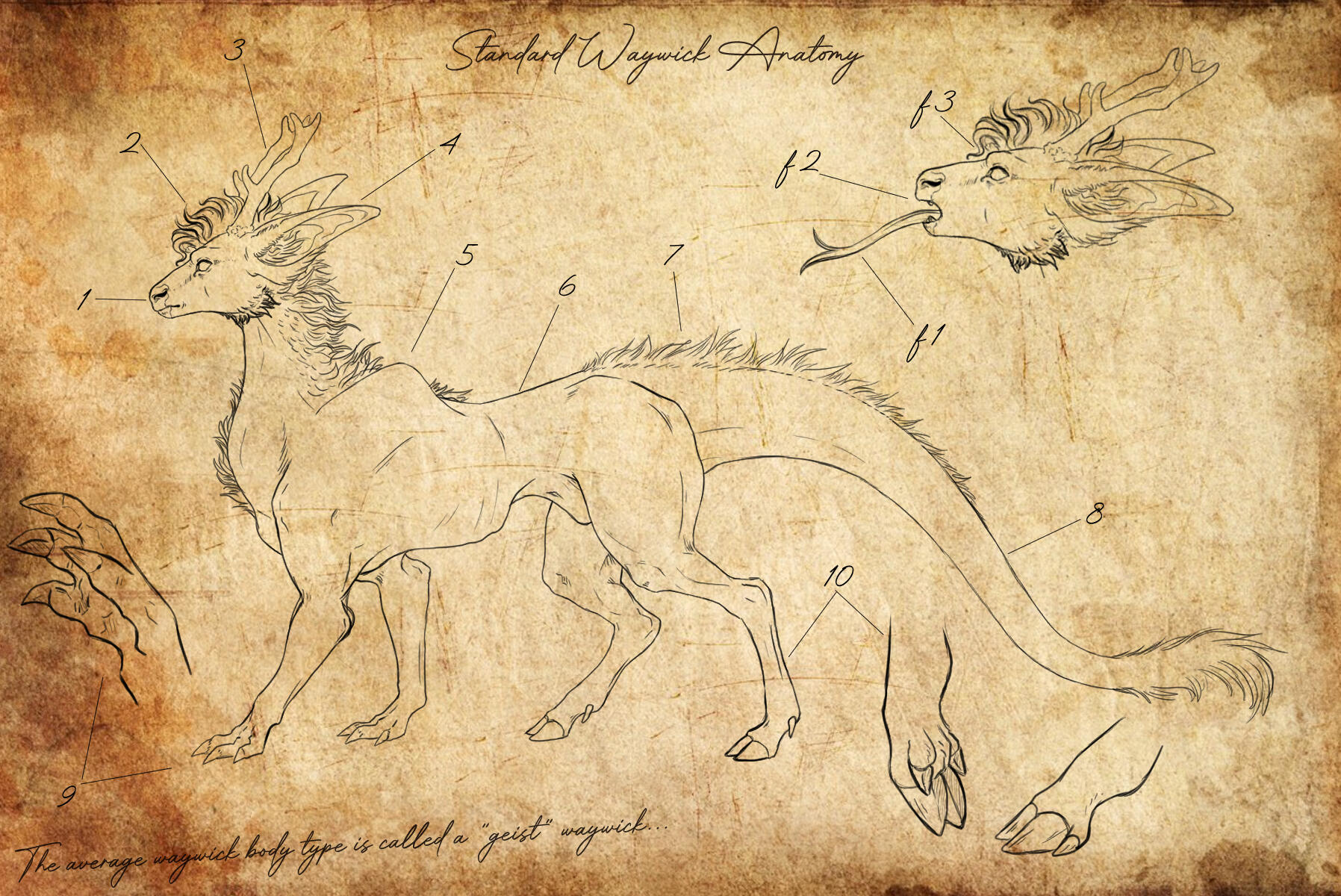 8 - long, sturdy tail.9. 4-fingered front paws are very dexterous, with strong nails.10 - Deer-like rear legs. Standard feet are cloven hooves, but there is a common mutation called cloverhoof that is present in many waywicks, wherein the dewclaws have grown into a third and forth toe.Face 1 - Long snake-like tongue is typically dry and body-temperature. It has very small receptors on it that can pick up energy signatures from other waywicks or other beings entirely. A waywick's energy memory is incredibly acute, and they can identify even the weakest of energy signatures of a being once they have registered it. Tongues are rapidly flicked up and down like a snake to look for signatures.Face 2 - Sharp canine teeth. When eating, two glands on the back of their jaw will secrete a saliva-like fluid to help bind and break down their chosen food.Face 3 - See infographic below for details.
