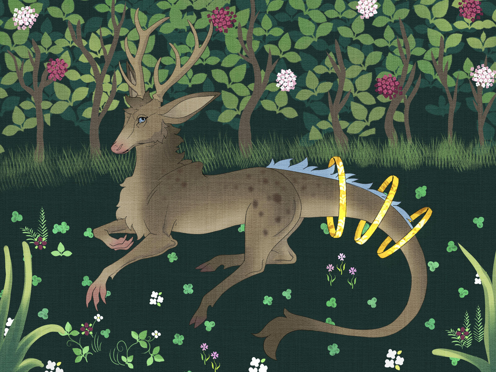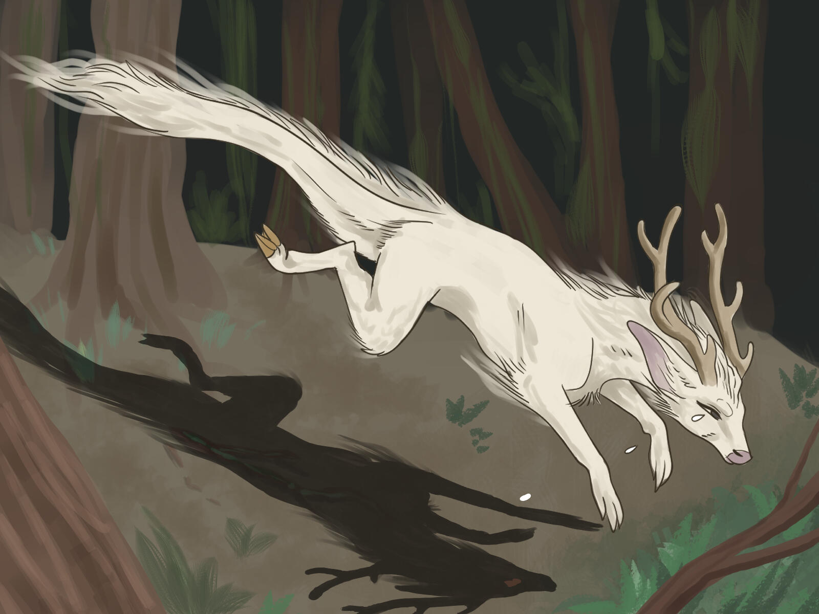 The bright white fur of the creature seemed to reflect the light that hit it more beautifully than a gemstone, the flowers and leaves and vines adorning it's grand, branching antlers made it resemble the magnificent trees it stood beneath. The creature towered over the humbled man for a moment, before darting away deeper into the forest.That encounter lingered in the man's mind for days on end as he traveled to and from the marketplace. Should he tell someone? Had he imagined the whole experience? No, it couldn't have been possible. These thoughts plagued his mind as he made the journey home in the dark one night.