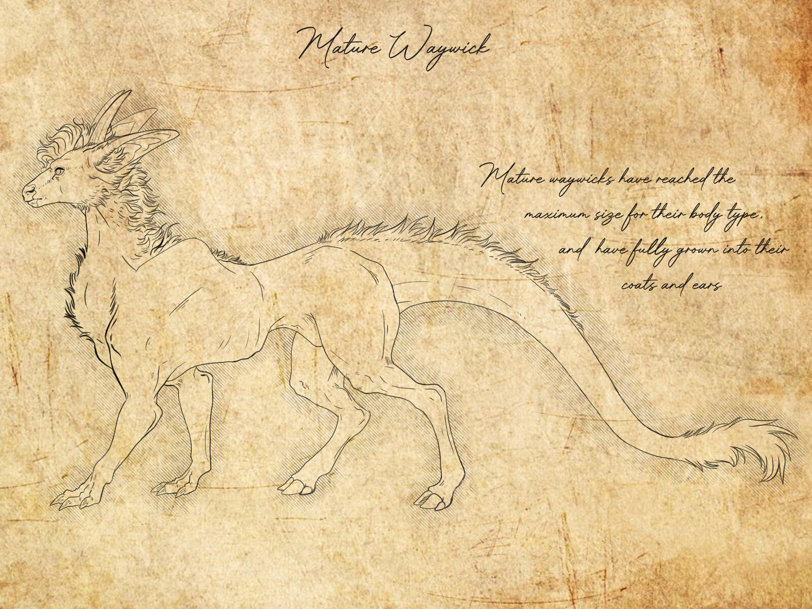 Wraith - Waywicks with the wraith body type are significantly larger than the standard geist waywick, standing at about 6 feet (182 cm) at the shoulders when standing quadrupedal. Their muzzle takes a more rounded "roman" nose shape like that of a clydesdale or moose, and their body tends to be bigger-boned and stockier than the standard waywick. Wraith manes and tails are significantly fluffier, and their dorsal fur extends the full length of their tail.