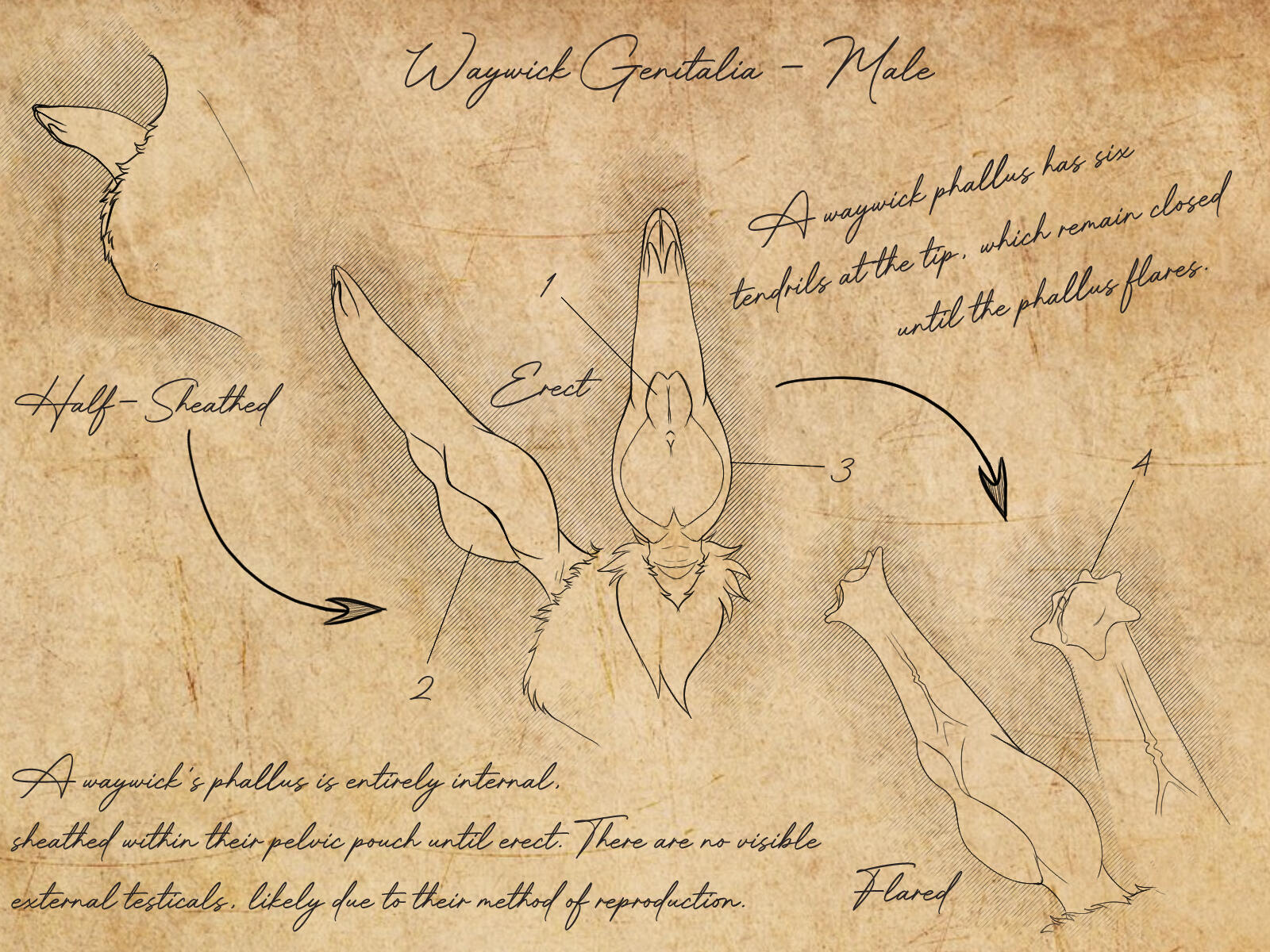 Waywicks, being spirits, are sexless by default and therefore do not need to follow standard mating procedures to bear offspring. In fact, it is not necessary at all for a waywick to have a partner for an egg to be produced and raised. If a waywick decides it wants an offspring, it can choose one of two options - asexual reproduction or energy hybridization.Asexual reproduction only requires that the parent waywick rest and build up excess energy within itself, after which it will shed a tear containing a shard of it's own source energy. The tear will promptly crystallize to form a protective chrysalis around the shard.For mated pairs or groups, energy hybridization is an option for bringing forth offspring that is born from the parents' energies. This process requires that all participating parties have an exchange of a piece of their source energy. This can be as simple of an act as linking hands, touching noses or intertwining tails, or it can be more intimate.For some waywicks, manifesting gender-specific anatomy can allow mated pairs or groups to preform more typical mating rituals as a means of energy exchange.Once the exchange is made, one parent will shed a tear containing the shard of combined energy.In terms of lifespan, waywicks are very similar to elves in the sense that they age much slower than humans, and it is unknown if there is a total life expectancy as there have not been recorded accounts of any waywicks dying of age-related issues. Typically, the rate at which waywicks mature is seven times slower than humans, so it will take seven years for a waywick to mature the equivalent of one year of human growth. Once a waywick reaches full maturity, age related changes to the body become much more subtle, and some mature waywicks have been found to be several centuries old.Because of the manner of their reproduction, waywicks are incapable of reproducing with other species, making waywick hybrids an impossibility.