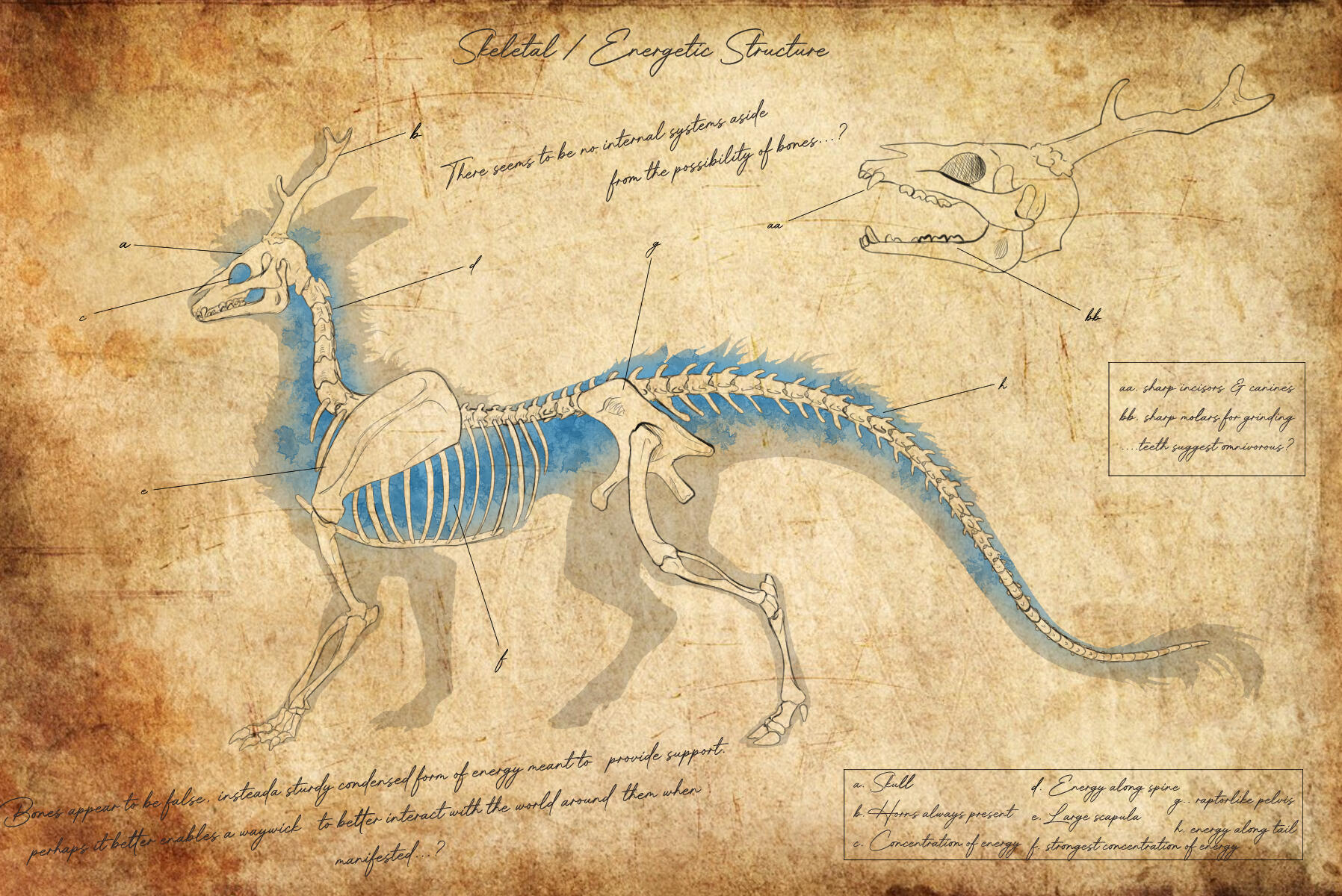 yes! A waywick's source energy will always be see in two distinct places - their eyes and their dorsal fur. The eyes of a waywick will always match with the color of their dorsal fur (the fur along the top of their tail) because the color comes from the same place.Other common locations you might see source energy include the inner ear or in the mouth, but there is no limit to where else a waywick's source energy can be visible.A waywick's source energy is most visible when they are dematerialized, such as when they are in The Aether. But a dematerialized waywick is not visible to the naked eye. Some rare glimpses can be seen in the odd photograph or ghostly encounter while they are in this state, but they cannot outright be seen unless someone has a pre-existing paranormal sensitivity.While waywicks do not have any internal organs due to the nature of their existence, They do form concentrated structures of energy that resemble bones. This is thought to be an evolutionary trait to help support their interaction with the material world when manifested by providing support to the body.While they do not have any digestive organs, waywicks often keep their energy's strength up by partaking in food and drink. what they choose to eat or drink seems largely up to personal preference, as there does not seem to be any impact on strength based on what they do or do not eat. Their manifested teeth seem to suggest an omnivorous diet, but waywicks eating a strictly carnivorous or herbivorous diet have been observed.