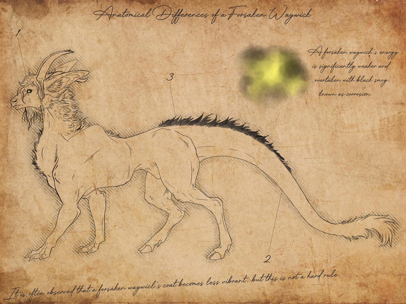 - Foraging /FORE-uh-jing/ - The act of hunting for food sources preformed by infant waywicks, in order to strengthen their energy.- Forsaken, the /for-SAY-ken/ - (Faction) a community of waywicks who have outright rejected móðir and their connection to her. They have become overtaken by their corrosion and have experienced significant physical changes to their anatomy. They tend to be very hateful towards humans and other similar races and are considered very dangerous and extreme.