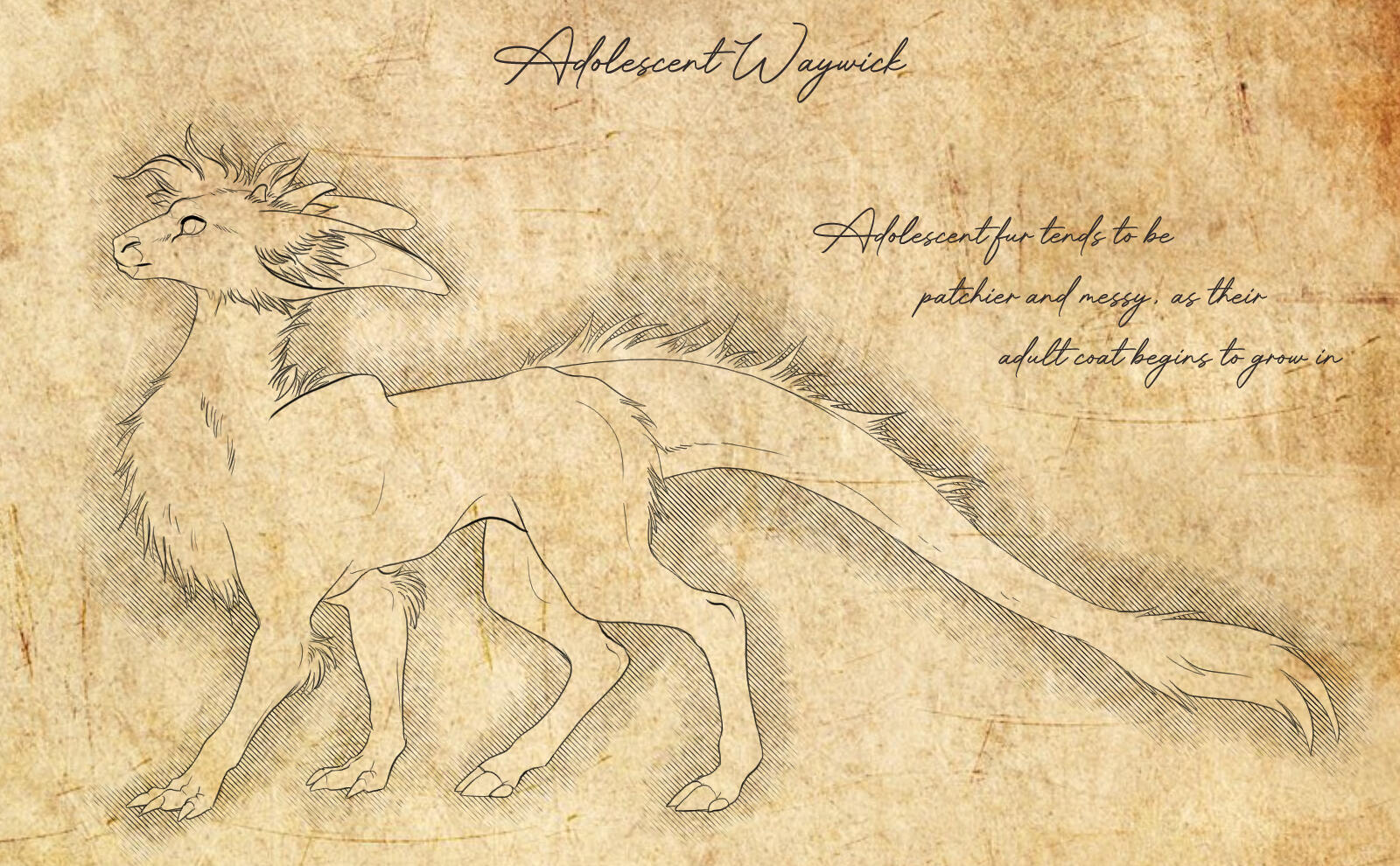 Phantom - Waywicks with the phantom body type have a smaller and more slender build than the standard geist waywick, standing at about 3 feet (91 cm) tall at the shoulders when quadrupedal. Their muzzle shape is notably more triangular and their ears are less broad. a phantom waywick's dorsal fur does not extend very far past the base of their tail.