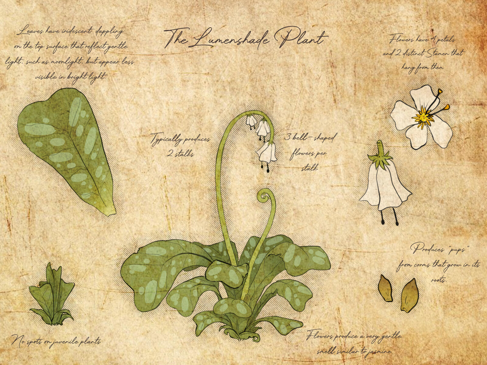 - 3 delicate, bell-shaped flowers that grow from the tips of each stalkLumenshade needs very gentle light to grow, and has evolved its spots as a way to regulate its photosynthesis. the cells within these spots open up at night to allow the sunlight reflected from the moon to be absorbed, causing the spots to give the illusion of glowing at night and leading to their namesake. During the daylight hours, the plant constricts its cells to block the intake of light and making the spots appear less visible. Because of their lighting needs, Lumenshade can be found in forest clearings with partial canopy coverage.Every part of the lumenshade plant can be consumed for slightly different effects.