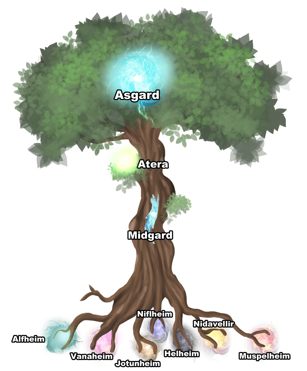 Atera, casually known as Hringr or The Circle, is a minor realm that sits just below Asgard on Yggdrasil. This realm is a very biodiverse world filled with a variety of Biomes, including forests, meadows, mountain ranges, oceans and more. Extreme differences such as arctic or desert conditions are minimal, but present in a few zones. But what stands out the most is what gives the realm it's namesake - a ring of small mountains surrounding a clearing. The central ring of Atera is a large clearing at the base of a mountain called Heaven's Peak. This is considered a safe location to the flora and fauna that live in Hringr, and it is the birthplace of Móðir. All waywicks, as well as a variety of other species, have access to Atera.Heaven's Peak is named such because of a waterfall starting at the peak of the mountain. The pool at the top of the mountain is fed directly from Aether and it is believed to be a gift from Asgard. Because of this, that top pool is considered a sacred place. The Sacred Pool waterfalls into a larger lake at the base of the mountain, called The Mirror of Asgard which feeds two rivers flowing throughout the realm. These rivers provide sustenance for both the plant and animal life within the area.