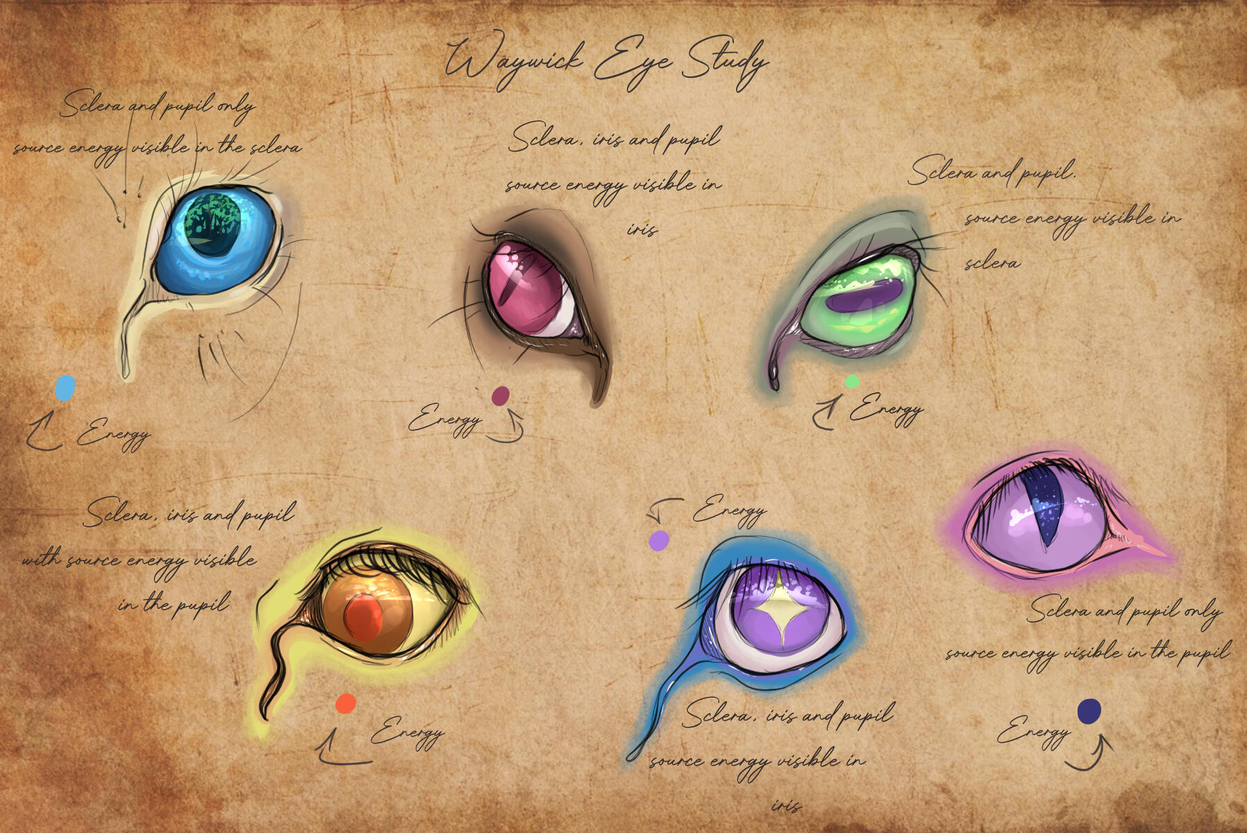Waywicks have a range of eye variations available to them, but one thing is always true: Their source energy is always visible somewhere in the eye. The energy color can be the sclera (the white part of a human eye), the iris (the color of a human eye) or the pupil (the black part of a human eye).There is no limitation to additional colors or pupil shapes for waywick eyes as long as the source energy rule is followed.