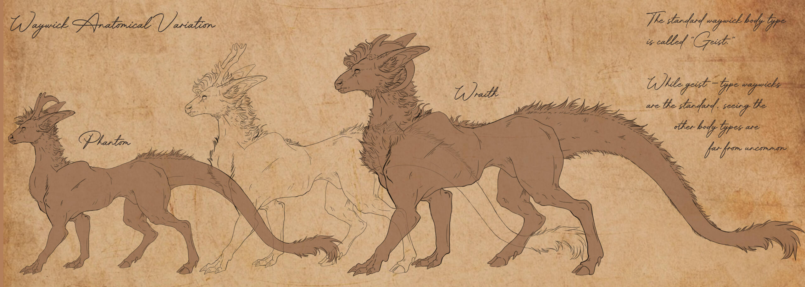 Phantom - Waywicks with the phantom body type have a smaller and more slender build than the standard geist waywick, standing at about 3 feet (91 cm) tall at the shoulders when quadrupedal. Their muzzle shape is notably more triangular and their ears are less broad. a phantom waywick's dorsal fur does not extend very far past the base of their tail.