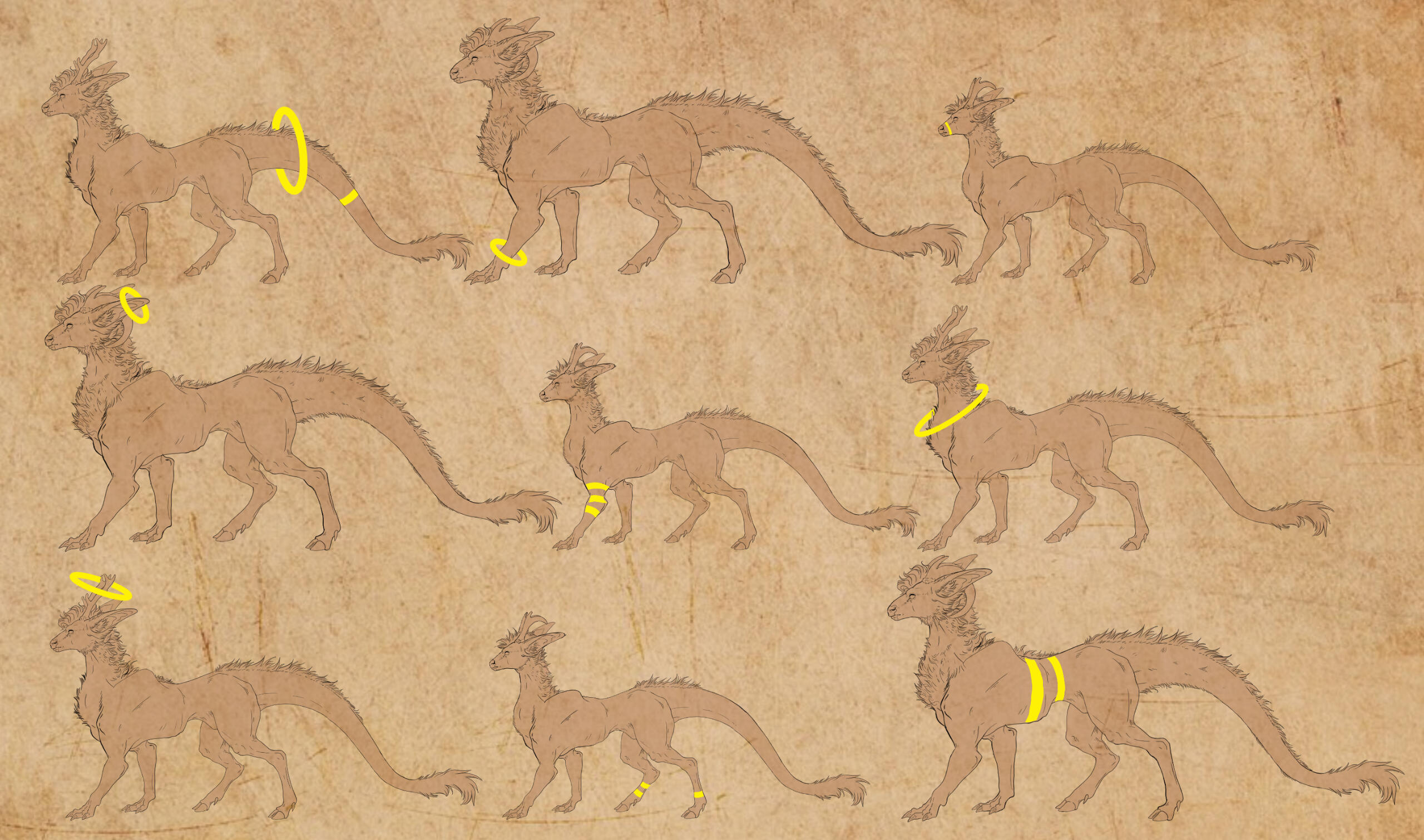 1 - Nose skin is rhinarium, like that of a canine. It is typically cold and wet to the touch. The rhinarium crosses over the bridge of the nose, over the nostril and over the center of the upper lip. This same skin covers their lower lip and the front of their chin, but it is dry and soft in that location.2 - Mane starts at the center of the forehead and continues down the neck to the center point between their shoulder blades. the thickest point of the mane is along the back of the neck.3 - A pair of horns is always present here. They can have horns anywhere else on their body as well, but this location is mandatory.4 - Long, thin ears. The back of the ears are covered in a velvety fur, while the inner ear is fleshy.5 - Strong, powerful shoulders. A waywick of the geist body type will range between 4 and 5 feet (121 - 152 cm) at the shoulders.6 - Slender body, but defined ribcage.7 - Dorsal fur starts at the base of the tail and continues along the top of the tail. this fur grows until roughly halfway down the tail.