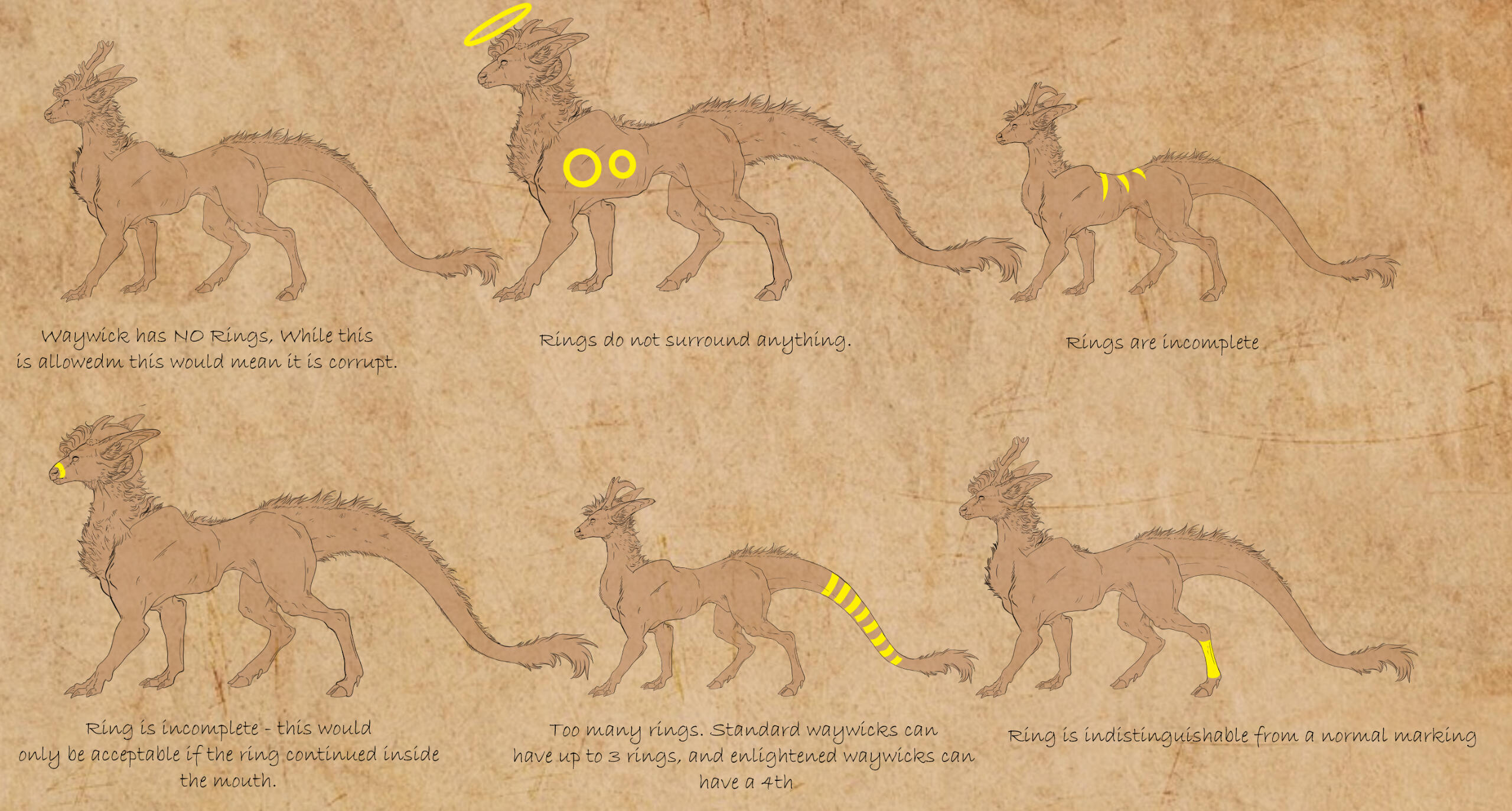 A waywick's rings can be pretty leniently placed, they just need to be around a part of their body. (ex. a wrist, their tail, their horns). If a waywick has more than one ring, they do not need to all be in the same location on their body. For example, a waywick with 3 rings could have 2 on their left wrist and one on their tail.Please note that ring-like markings are still allowed without being 'rings,' so it is encouraged to make any marking-style rings distinct and easily recognizable as such