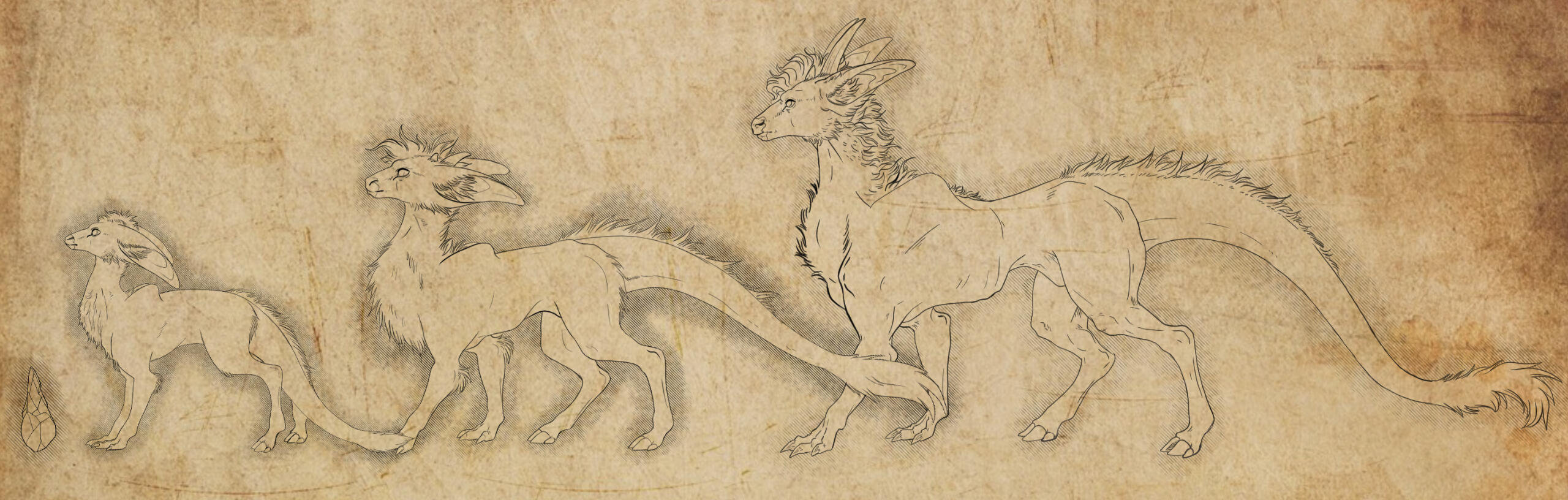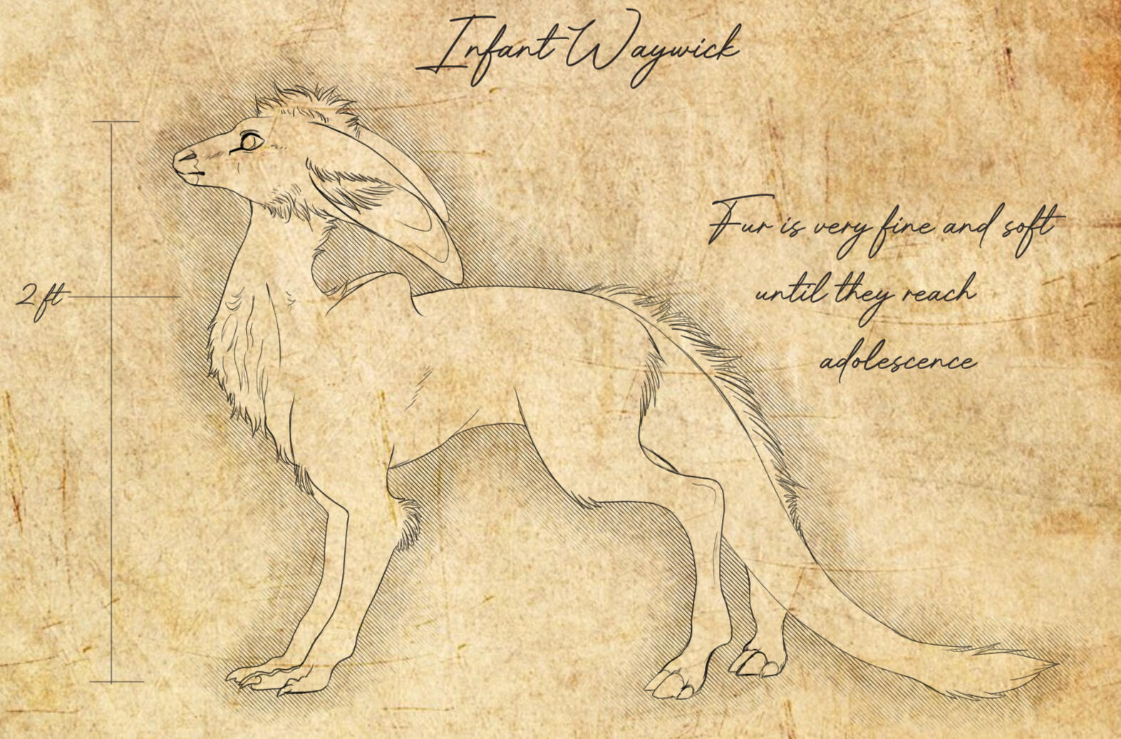 "Hatching" is a loose term used to describe when a waywick's source energy is finally strong and independent enough to leave it's crystal shell. By the time a waywick hatches, its energy has become its own separate entity and it's connection to its parent/s has become severed. Once hatched, the shell of the crystal will shatter and dissolve into the earth, acting as a strong fertilizer and causing the plant life in the area to flourish.Upon hatching, a waywick begins its infancy stage. Infant waywicks can be spotted by their smaller size (ranging between 1 and 2 feet tall at the shoulders) and lanky limbs. Their ears are very large and awkward, as they do not yet have the strength built up to handle them well. Their tails are also notably stubbier, as length and dexterity are achieved as the infant ages.