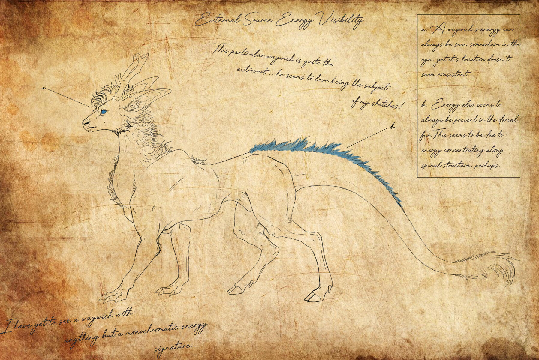 Waywicks are capable of taking on a bipedal, or human-like body type, and spend most of their social time in this form.Waywicks are very intelligent and sociable beings as is, but this is definitely accented in these forms. They are capable of behaving very similarly to their human (or otherwise humanoid) counterparts, even going so far as to don articles of clothing if desired, or participating in communal activities.Waywicks by default are sexless beings, but they are capable of choosing a gender preference based on the levels of masculine or feminine (or lack thereof) energy within their signature. Anthro waywicks are capable of manifesting with the physical features of their chosen gender if they choose, and can manifest male, female, intersex or no genitalia based on their individual energy signatures.Phantom, Geist and Wraith traits continue to be evident in anthro waywicks, however their height seems to be more sporadic than their feral manifestations. While phantoms are typically shorter then geists, and geists are typically shorter than wraiths, there are plenty of outstanding cases where this does not hold true. It is assumed that this may be associated with energy signatures.