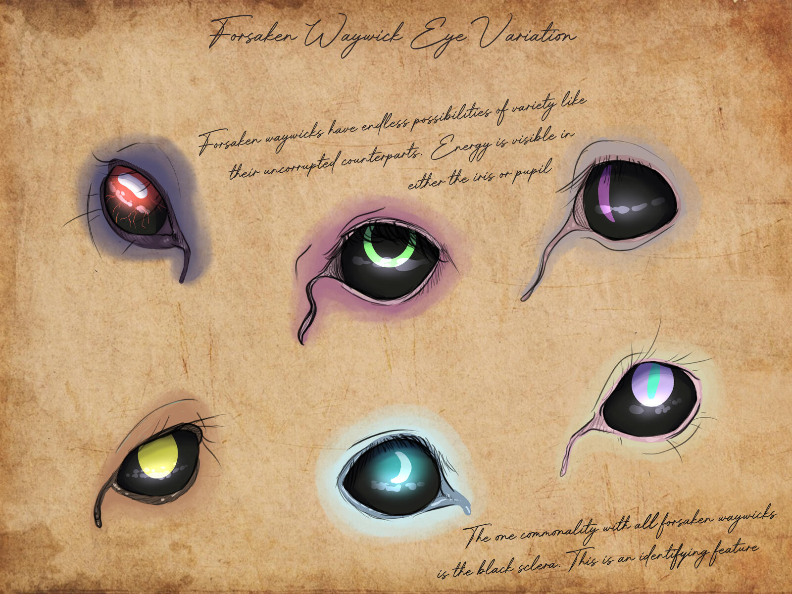 Forsaken waywick eyes have quite a bit of variation allowed as well, but the sclera will ALWAYS be black, with their source energy color being either in the pupil or iris of the eye. There is no restriction on additional colors or pupil shapes as long as the color rules are followed