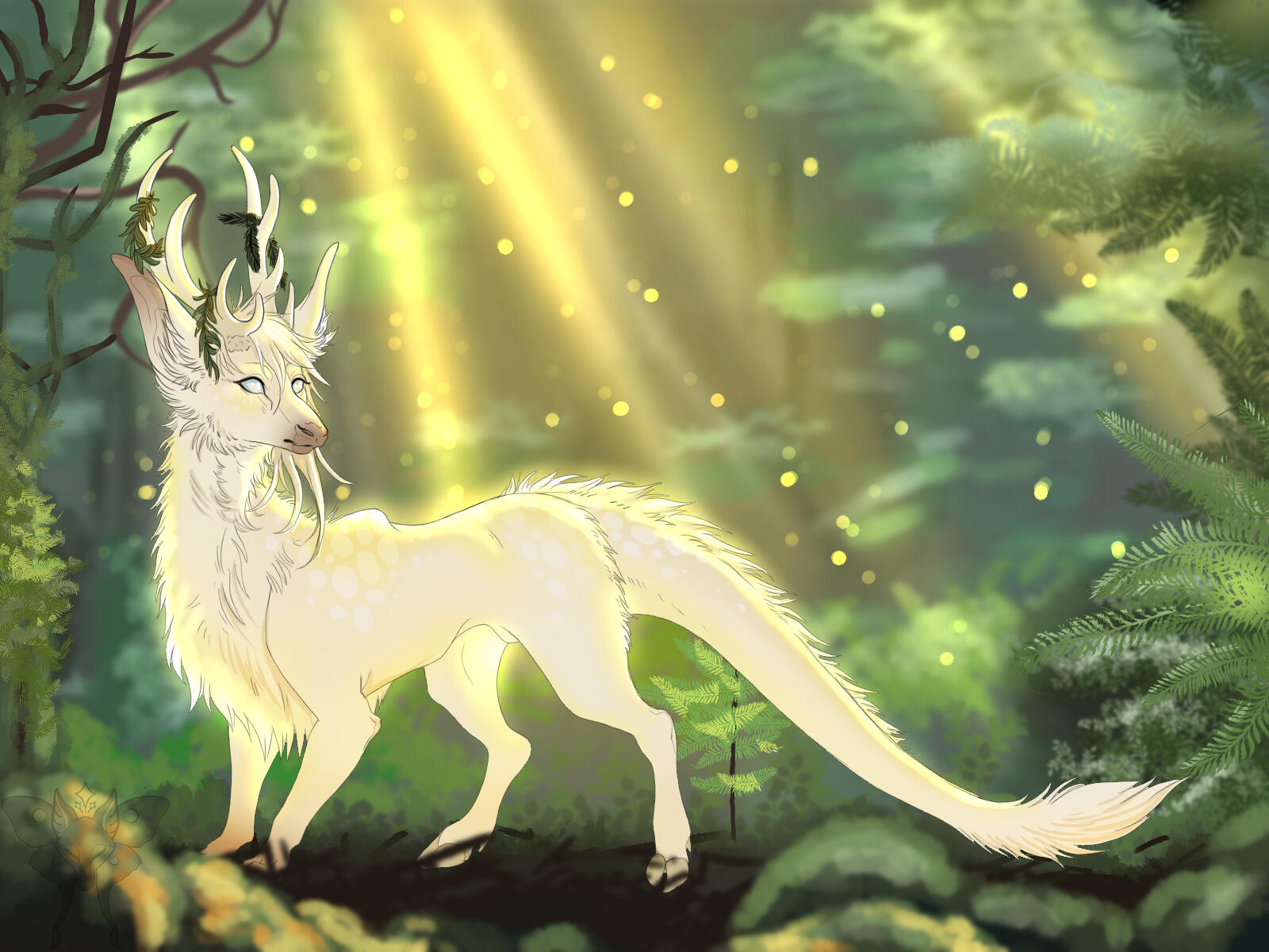 The bright white fur of the creature seemed to reflect the light that hit it more beautifully than a gemstone, the flowers and leaves and vines adorning it's grand, branching antlers made it resemble the magnificent trees it stood beneath. The creature towered over the humbled man for a moment, before darting away deeper into the forest.That encounter lingered in the man's mind for days on end as he traveled to and from the marketplace. Should he tell someone? Had he imagined the whole experience? No, it couldn't have been possible. These thoughts plagued his mind as he made the journey home in the dark one night.