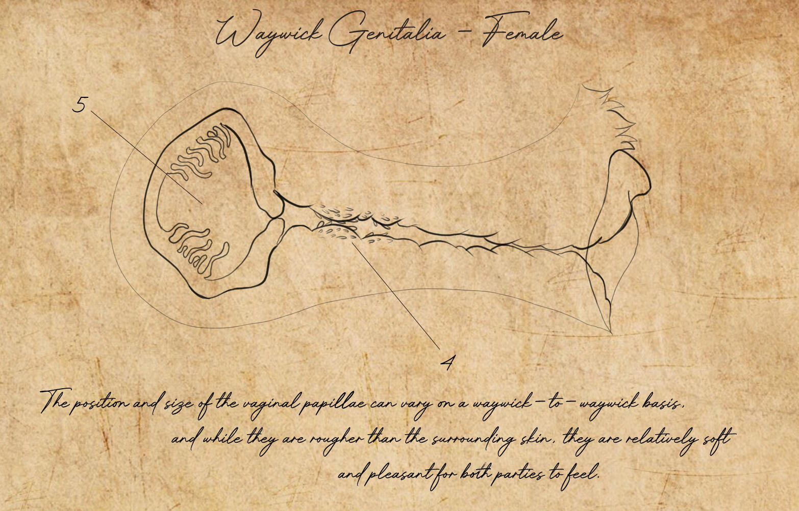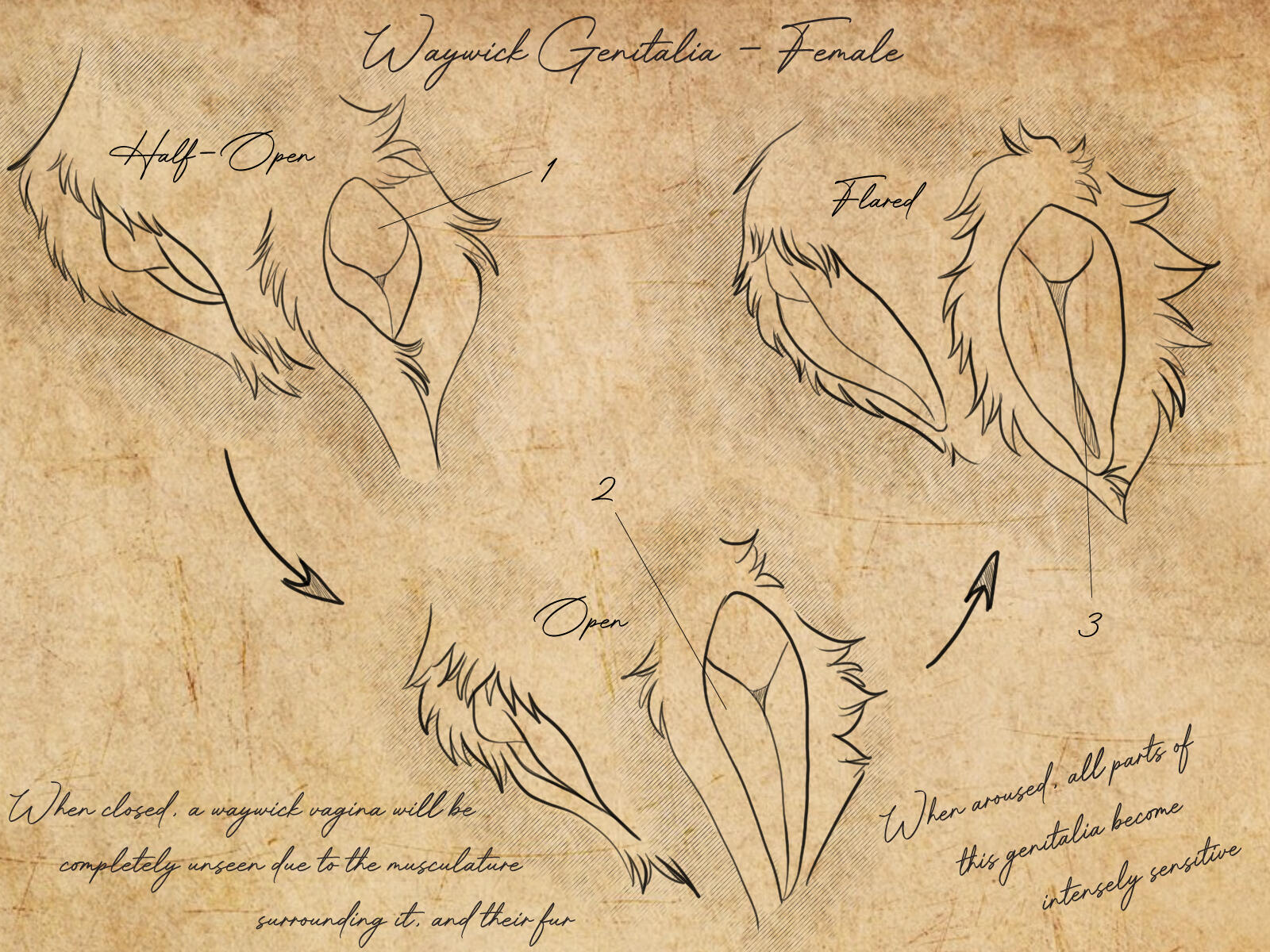 Waywicks, being spirits, are sexless by default and therefore do not need to follow standard mating procedures to bear offspring. In fact, it is not necessary at all for a waywick to have a partner for an egg to be produced and raised. If a waywick decides it wants an offspring, it can choose one of two options - asexual reproduction or energy hybridization.Asexual reproduction only requires that the parent waywick rest and build up excess energy within itself, after which it will shed a tear containing a shard of it's own source energy. The tear will promptly crystallize to form a protective chrysalis around the shard.For mated pairs or groups, energy hybridization is an option for bringing forth offspring that is born from the parents' energies. This process requires that all participating parties have an exchange of a piece of their source energy. This can be as simple of an act as linking hands, touching noses or intertwining tails, or it can be more intimate.For some waywicks, manifesting gender-specific anatomy can allow mated pairs or groups to preform more typical mating rituals as a means of energy exchange.Once the exchange is made, one parent will shed a tear containing the shard of combined energy.In terms of lifespan, waywicks are very similar to elves in the sense that they age much slower than humans, and it is unknown if there is a total life expectancy as there have not been recorded accounts of any waywicks dying of age-related issues. Typically, the rate at which waywicks mature is seven times slower than humans, so it will take seven years for a waywick to mature the equivalent of one year of human growth. Once a waywick reaches full maturity, age related changes to the body become much more subtle, and some mature waywicks have been found to be several centuries old.Because of the manner of their reproduction, waywicks are incapable of reproducing with other species, making waywick hybrids an impossibility.
