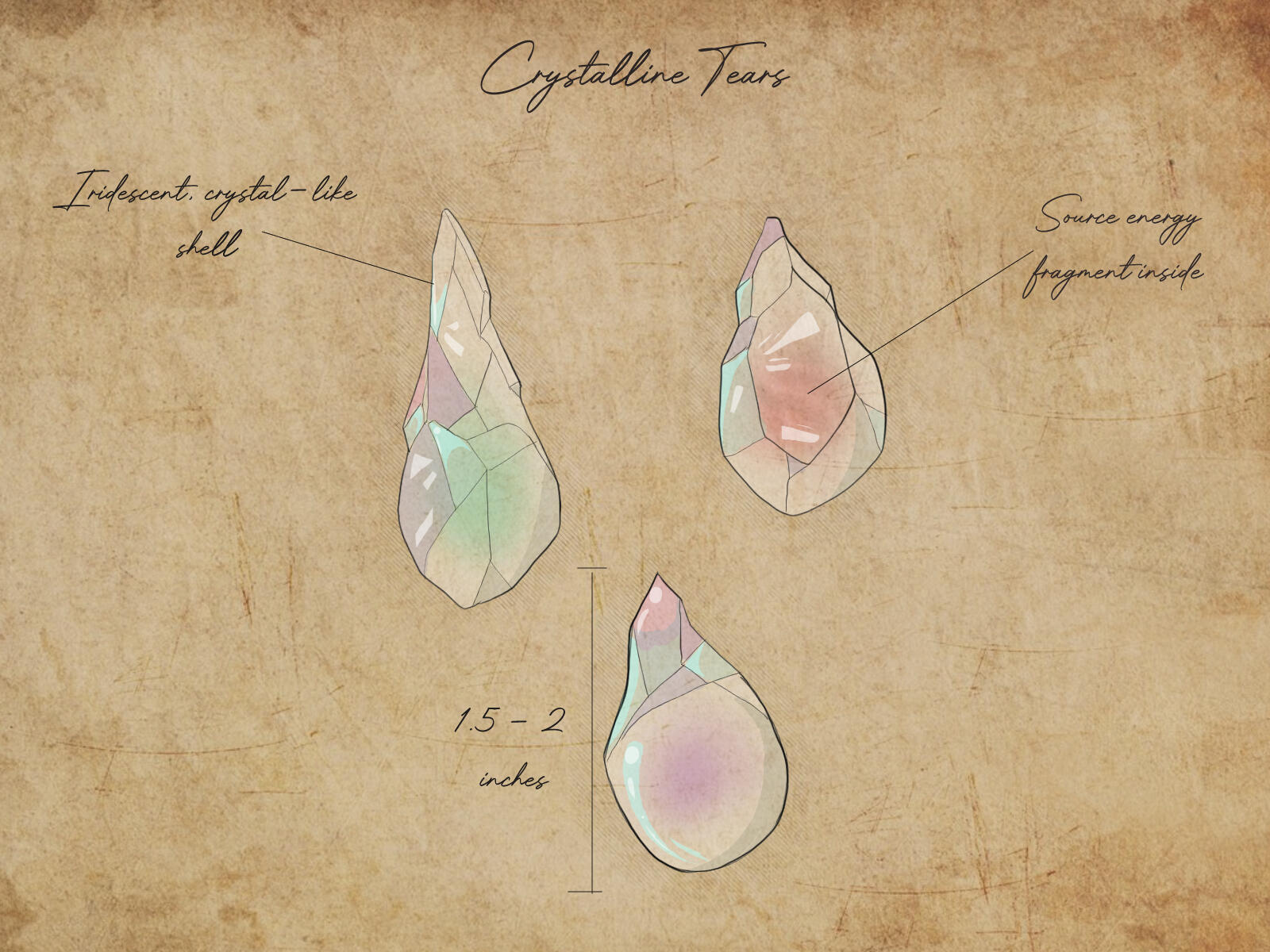 It was angry. It was scared. It had lost it's human. A part of it wanted vengeance, a feeling it had never experience before. For days on end the False Deer wept, and in an attempt to heal it expelled the negative vengeful energy, causing a rift in it's life source energy. For a moment the energy manifested and stood there beside the beast, staring at it's other half. It was similar to the beast, but there was an eeriness that the beast lacked. With a flash of light, the dark energy vanished and the creature was once again alone.Feeling no better, the creature once again began to weep, running deep into the forest. Each tear that fell seemed to take a small piece of the spirit's energy with it, crystallizing before landing softly upon the forest floor. The crystalline tears nestled the small slivers of energy trapped within, as if they were trying, little by little to comfort the creature.